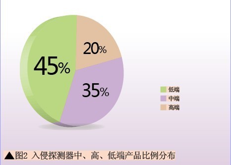 根据调查统计,入侵探测器市场容量约有1200万只,其中高、中、低端的比重分别是2:3.5:4.5。(如图2)
