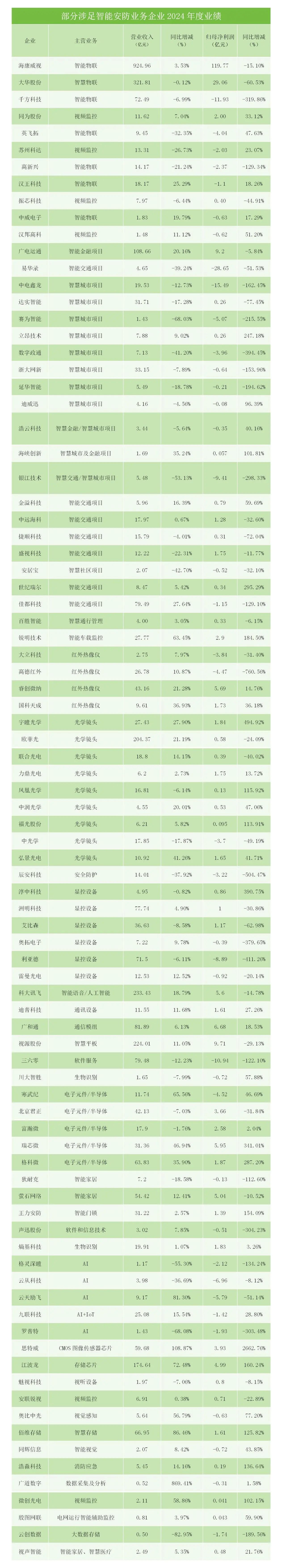 在细分领域方面,视频监控、光学镜头、AI、智能家居、智能交通、智慧城市等领域分化明显、涨跌不一。其中,在视频监控领域,抛开头部企业,中小企业生存压力得到缓解,比如苏州科达2024年营收虽然下滑,但亏损幅度收窄;同为股份则实现营收和利润双增收;汉邦高科报告期内营收同比增长的同时,亏损幅度收窄等。